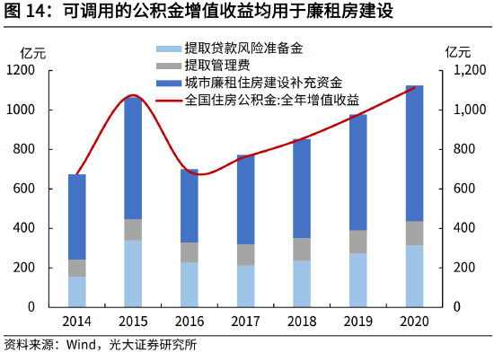 3)可调用的住房公积金增值收益目前全部用于廉租房建设,用于保障性租赁住房建设的资金有限。2020年全国住房公积金增值收益为1113亿元,提取贷款风险准备金和管理费之后,全部用于城市廉租住房建设补充资金,2020年为688亿元。