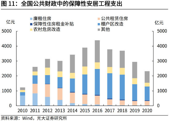1)保障性安居工程中,中央财政补助一直充当重要资金来源。根据审计署披露,2012年投向保障性安居工程的中央补助资金为1862亿元,至2017年提高至2488亿元。考虑到地方财政支出在内,用于保障性安居工程的公共财政支出在2016年最高达到4391亿元,近年来随着棚改力度减弱,2020年回落至3129亿元。随着保障性租赁住房建设的持续推进,预计中央补贴力度也将加大。若参照2016年的支出强度,预计新增财政资金可以达到1000亿左右。