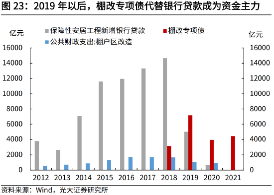 棚户区改造以政府主导、由市场运作的模式开展,采用实物安置与货币安置相结合的方式。2014年以前,棚改以实物化安置为主,资金主要来自财政补贴,这一时期政府通过建设新房来安置棚户区居民,政府直接划拨土地给开发商。2014年-2018年,国家开始推出PSL,地方获得较多低成本资金支持,加上2015年三四线城市去库存压力较大,各地开始加大棚改货币化安置比例。2016年,棚改货币化安置比例达到48.5%,较2015年增加18.6个百分点。