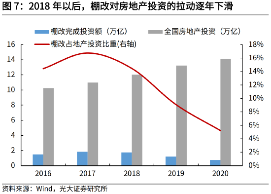 “十二五”期间,在公租房、棚改大规模建设的支撑下,我国保障性安居工程建设规模接近同期房地产投资的15%。“十三五”期间,我国保障性安居工程以棚改为主,2016-2020年,全国棚改开工2300多万套,完成投资约7万亿元,占房地产投资的12%。但在2019年之后,随着棚改进入收尾阶段,对房地产投资的支撑明显下滑。2020年,预计棚改建设规模为143万套,对应投资额为7000亿元,占同期房地产投资的比重仅为5%。