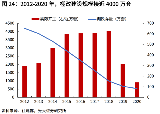 棚户区改造,最早于2005年在辽宁省试点,2008年被正式纳入保障性安居工程,目前已进入收尾阶段。棚户区改造最初目的是改善居民住房条件,缓解城市内部二元矛盾,同时也承担拉动投资、消费需求,以及三四线城市房地产去库存任务。