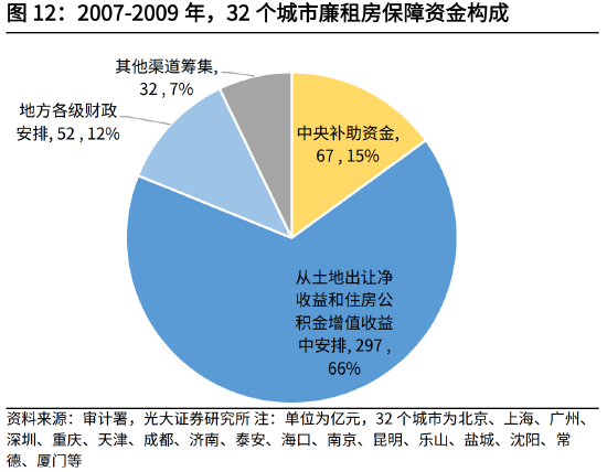 以往的保障性安居工程中,资金来源主要两部分,一是财政资金,例如廉租房建设使用的中央财政补助、地方财政资金、提取贷款风险准备金和管理费用之后的住房公积金增值收益、土地出让净收益的10%以上等。二是银行贷款、专项债、企业债等社会渠道资金,例如棚户区改造中,涉及的政策性银行发放的棚改专项贷款、商业银行贷款、棚改专项债、城投平台发行的投向棚改项目的企业债等。