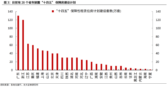 我们估算“十四五”期间,全国保障性租赁住房筹建规模接近900万套。在各省住建厅公布的“十四五”保障性租赁住房计划中,由于部分城市仅表示将开展保障性租赁住房建设项目,暂未提出具体目标,因此我们以各地最新住宅成交面积作为基准,利用已披露计划的城市的拟建设套数,推算出未披露计划城市的拟建设套数,最终估算出,“十四五”期间26个省市保障性租赁住房建设套数为882万套,其中筹建规模最高的前五大省市为广东、浙江、江苏、重庆、福建,占全国比重接近50%。
