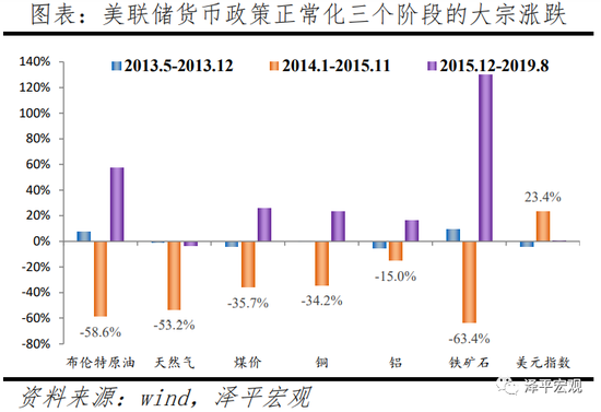 从历史数据看,在上一轮美联储货币政策正常化周期内,实质性缩减购债行动期和加息准备期内美元指数上行幅度达23.4%,同时对大宗商品价格的回落幅度影响最大;其中,以原油、天然气和煤炭为代表的能源类大宗商品价格降幅分别达-58.6%、-53.2%、-35.7%,以铜、铝、铁矿石代表的有色和黑色金属矿价格降幅分别达-34.2%、-15.0%、-63.4%。与此同时,对应中美PPI阶段表现分别从-1.64%和1.3%下行至-5.9%和-1.3%。