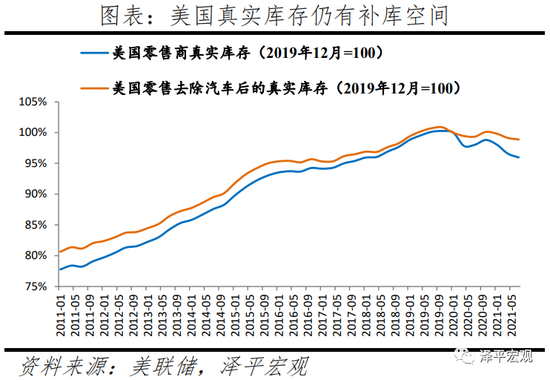 美国库存周期处于被动补库阶段,仍有空间,主要受三条逻辑支撑。第一,当前美国实际库存水平仍处低位。美国名义库存基本恢复至与疫情前持平,但由于通胀水平较高,实际库存仅恢复至疫情前约95%的水平。剔除汽车,实际库存也仅为疫情前的97%。第二,随着流动性收紧、供应链和就业持续恢复,通胀预期回落,补库意愿将进一步提升。第三,疫情常态化假定下,销售商对疫情反复所导致的供应链、就业以及产能等问题的担忧将加剧,有增加预防性库存意愿,合意库存水平料将上升。