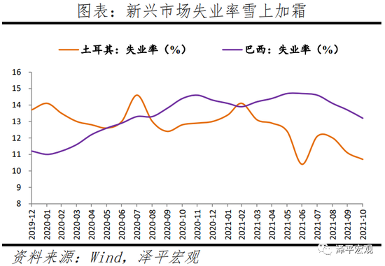 第三,随着全球需求见顶,新兴经济体出口增速或将见顶回落。全球需求或在2022年中放缓,新兴经济体出口压力显现。同时,警惕全球需求的回落将导致新兴经济体就业市场进一步萎靡,形成负循环。