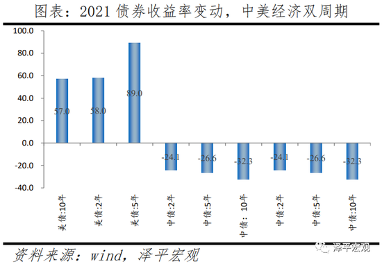 2021年,全球经济由复苏到过热,大类资产中股市、大宗商品逐步有所表现。随着全球流动性环境由宽松向正常化推进,大类资产股市和大宗商品品种逐步转向结构分化。而中美经济和货币政策呈现双周期特征,我国在2020年提前进行了货币正常化进程,而美国经济复苏和货币正常化节奏滞后,年度国债收益率表现出涨跌各异特征。