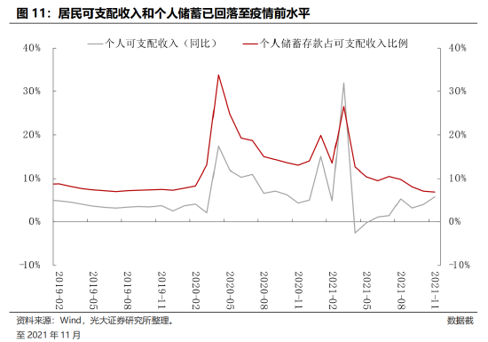 第一,美国通胀可持续性较差,通胀后期回落降低美联储加息动力。如前文所述,供给端问题已经边际缓解,而需求端的支撑也在逐步回落。耐用品消费增速同比已从2021年3月的18.8%回落至2021年11月的10.5%; 非耐用品消费增速虽然维持平稳,但上行空间有限。占美国GDP比重最大的服务消费同比缓慢复苏。展望来看,供需矛盾正在逐步缓解,叠加美国居民收入和储蓄持续下行,通胀压力预计在2022年第一季度进入筑顶阶段,不具备可持续性。