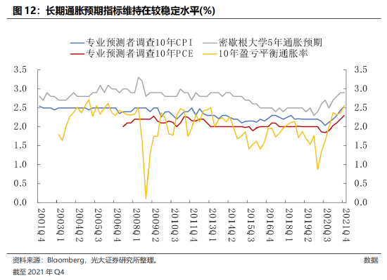 第二,美国长期通胀预期仍处于较合理水平。历史数据证明,长期通胀预期对实际通胀走势影响较为显著,参见我们2021年12月16日外发报告《鸽派鲍威尔,鹰派点阵图》。因此,美联储时刻关注长期通胀预期,并锚定长期通胀预期在稳定位置。