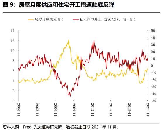 住所项价格环比上行0.4%,同比升4.2%,因住所项在CPI中的比重较大(32%),其对环比CPI贡献达0.13%。一方面,疫情趋弱,劳动力回城提升租房需求,推升房租价格。另一方面,供应链问题导致美国新屋开工数量低迷,房屋空置处于历史低位0.9%(第三季度),显示供需仍偏紧,带动房屋和租金价格上行。