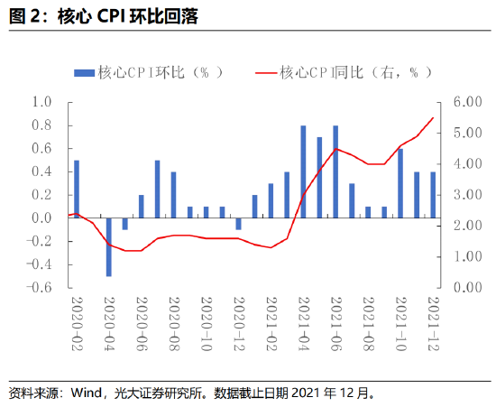 美国12月CPI同比略不及预期,环比连续第二个月回落,住所项、新车、二手车和卡车为主要贡献项。供应链问题好转缓解通胀压力,预计通胀将在2022年一季度筑顶,并在之后趋于回落。