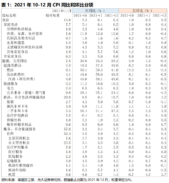 展望来看,能源价格对CPI的支撑是有限并且不可持续的。以美国劳工部能源项CPI指数与指数权重的计算方式来看,12月能源项同比升29.3%,拉动CPI上行1.8个百分点。若我们假设,如能源项同比持续上行至35%(2000年以来历史最高位为34.8%),CPI同比上行至8%,则能源项对CPI的额外拉动预计在0.1个百分点,对通胀的威胁也是有限的。