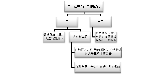 第一,合同终止问题。LIBOR替换涉及金融工具合同条款变更。从会计上看,金融合同条款变更,会触发合同修改(Modification)。如果修改影响不大,可使用替换前有效利率认定利润和损失,并反映在银行的当期损益中。如果利率替换造成了大影响(Substantial),就会造成合同终止(De-recognition)。国际财务报告准则第9号(IFRS 9)提出的“10%测试”的方法规定,由于合同条款变更造成估值波动超过10%的金融产品必须终止原合同、签订新合同。除“10%测试”外,还有一些定性评估方法,即使合同价值变化小于10%,也可基于这些标准判定为大影响。如果金融工具的条款修改被认定为“大影响”,合同首先将被终止,相关损益反映在当期利润表中。同时,还需要认定一个新合同,如果新合同为银行的资产,则要进行SPPI测试和业务模式测试[12],以确定新工具的会计分类。如果为银行负债,则要对内嵌衍生品合约进行评估(图3)。