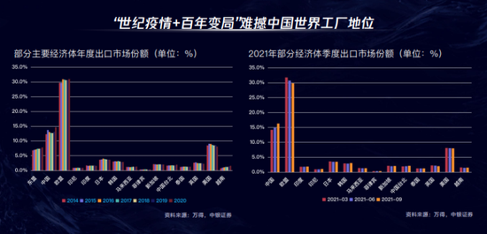 2021年一季度,中国的出口市场份额是14.2%,二季度是14.9%,三季度预计大概是16.3%。