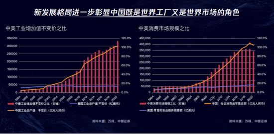 目前,中国的工业增加值或者说制造业的体量已经超过了美国,从社会零售消费品的总额来看,中国消费市场的规模已经相当于美国的90%,是世界上第二大消费市场。
