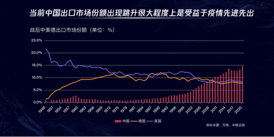 2020年开始,新冠肺炎疫情在全球肆虐,中国实现先疫先出,出口市场份额出现较大跳升。从二次世界大战结束以后,战后初期美国曾经一枝独秀,出口市场份额占到了全球的20%以上。到了上世纪八到九十年代以后,美国和德国两个国家交替问鼎全球出口老大。但彼时两国的出口市场份额都没有超过13%,2019年以后,中国的出口年年全球第一。