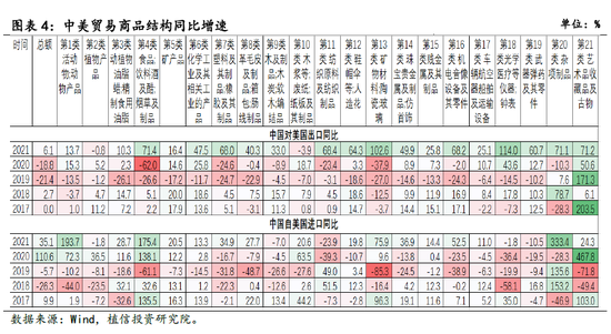 第一阶段期间美国对我国的贸易逆差形势未变。虽然我国对第一阶段协议的执行力度并不小(图表3),但期间美国对我国的进口依赖度加强,贸易逆差不断扩大。美国自我国的进口增速2019-2021年间显著上升,由-21.4%升至6.1%。从商品结构上看,美国对我国的进口依赖是全面性的(图表4)。