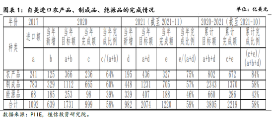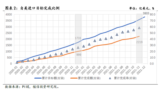 疫情扰动、通胀高企和高水准目标导致中美第一阶段经贸协议执行存在不小难度。截至2021年11月,我国自美进口约完成两年总目标的58%。农产品、制成品和能源品的进口分别已完成两年目标的84%、58%和43%(图表1和图表2)。一是农产品采购完成度较高,达到84%,对其他农产品进口国产生挤出效应。农产品的两年目标新增量仅为2017年进口额的1.3倍,且农产品价格弹性小且进口需求稳定,故完成难度相对较小。二是能源品采购完成度较低仅为43%,主因是能源品的两年目标新增量高达2017年进口额的7.7倍,目标设定较高。三是制成品完成比例介于农产品和能源品之间,为58%。制成品行业对劳动就业要求较高,但美国疫情波动、结构性失业严重,加剧了制成品供给紧张程度。