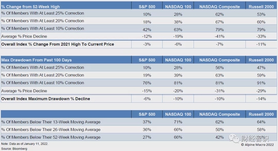 另外一个角度是看看标普和纳斯达克综合指数成分股中股价低于一年前的占比,前者为27%,后者高达42%。