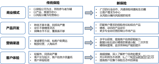 相比于传统保险模式,新保险模式不论在商业模式、产品开发、营销渠道还是客户体验方面,都有着明显的差别。