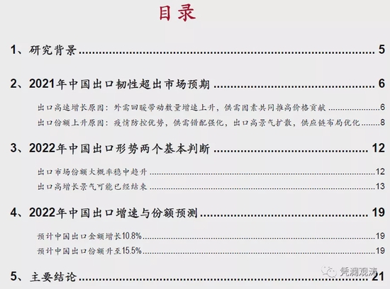 为什么2021年中国出口韧性远超市场预期?2022年出口高增长态势还会延续吗?本篇报告主要围绕这两个问题进行解答,文章结构如下:
