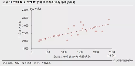 2021年4月份德尔塔病毒蔓延初期,各国疫情防控政策力度加大。但此后随着全球疫苗接种率提升,各国应对确诊病例的医疗资源相对充足,越来越多的国家开启了与病毒共存模式,疫情防控力度总体趋缓(见图表9)。然而,随着各国社交隔离措施逐步放宽,人员接触增加,病毒传播风险也在加大。例如,自2021年年中开始,新加坡将此前追求清零的政策转向学习与病毒共存,虽然该国疫苗完全接种率较高,但开放之后出现了疫情再次暴发的情况,10月末单日新增确诊病例最高超5000例。相反,中国在加快推动疫苗接种的同时,持续实行严格的防疫政策,虽然疫情略有反复,但新增确诊病例很少(见图表10),尽可能地避免了疫情大范围传播蔓延,保障了外贸企业生产活动平稳开展。2020年4月至2021年末,全球(不含中国)月度新增确诊病例与中国出口金额的相关系数高达0.75,表明国内外疫情防控差异对中国出口影响较大(见图表11)。
