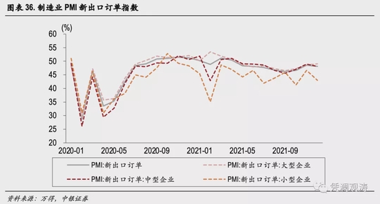 目前,国内中小企业出口普遍存在“有单不敢接”或“增收不增利”的现象。2021年5月份以来,中国制造业PMI指数中的新出口订单指数持续低于50,其中,中型企业和小型企业新出口订单指数渐次走低,小型企业的新出口订单指数更是从2021年3月份起就持续低于荣枯线,过去两年来仅有2020年的1月和10月高于50(见图表36)。