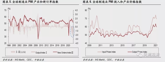 受疫情冲击以及恶劣天气等因素影响,全球供应链受阻,叠加需求快速恢复,供需缺口明显加大。2021年3月份以来,全球制造业PMI产出指数持续低于新订单指数,两者差值在10月份达到2.2个百分点,为12年以来最大缺口(见图表5)。同期,投入价格指数与产出价格指数均出现明显上涨,10月份分别升至74.4%、63.7%,创2009年以来新高(见图表6)。