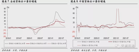2021年3月至9月,全球商品出口价格同比保持两位数增长,9月份增速升至15.8%,而出口数量增速仅为3.0%(见图表7)。2021年7月至9月,中国商品出口价格同比增速扩大,9月和12月出口价格增速分别为10.6%、9.3%,分别大于当月出口数量8.4%、7.3%的增速,是出口金额增长的主要贡献项,不过其他月份出口金额增长仍以数量贡献为主(见图表8)。