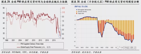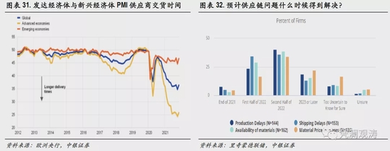 2021年10月份,全球制造业PMI中的供应商交付指数降至34.8,创下历史新低(交付指数越低,表明交付时间越长)。理论上,供应链中断以及经济复苏引起的需求增加都会延长交货时间。欧央行对全球(不包括欧元区)PMI供应商交货时间的分解结果表明,尽管需求因素发挥了主要作用,但供应链中断贡献了过去六个月交货时间延长的三分之一,并且贡献程度不断加深。这与同期纽约联储公布的全球供应链压力指数走势较为一致,2021年10月份升至4.37,创历史新高。虽然两项指标在11月、12月均有改善迹象,但仍然明显偏离常态水平,反映供应链问题依然严峻(见图表29、30)。另外,需要指出的是,发达经济体供应商交付时间远长于新兴经济体,表现出明显的异质性(见图表31),这可能与发达经济体需求恢复速度明显快于新兴经济体有关。