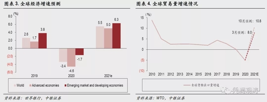 2021年,随着疫苗接种率不断提升以及各国宽松财政货币政策支持,全球经济快速恢复。2022年1月份,世界银行发布最新的《全球经济展望》预计,2021年全球GDP增长5.5%,其中发达经济体增长5.0%,新兴市场与发展中经济体增长6.3%(见图表3)。2021年10月份,WTO预计2021年全球贸易量增长10.8%,较3月份预测结果上调2.8个百分点(见图表4)。