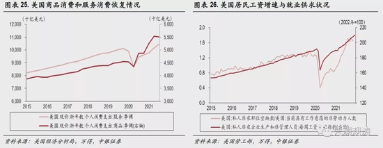 商品消费逐渐转向服务消费,对出口拉动有限。新冠疫情暴发之后,受宽松政策影响,美国消费需求恢复明显快于生产(见图表12)。个人收入中的转移支付收入和雇员报酬增幅明显,带动商品消费远超历史趋势水平,成为拉动中国商品出口增长的重要原因;而居民服务消费由于受到疫情防控、社交隔离措施制约,迄今尚未恢复到疫情前水平(见图表25)。2022年,基准情形下,随着疫情逐步好转,发达国家社交隔离措施进一步放开,居民对商品的过度消费可能减少,而增加的服务消费对中国出口拉动作用有限。不过,考虑到美国劳动力短缺仍然严重(见图表26),预计短期工资上涨趋势可能继续,延缓商品消费需求回落速度。