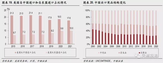 入世之后,中国迅速融入全球经济和贸易体系,在全球市场的进出口份额均在上升。2019年,中国进口和出口份额分别为10.8%、13.3%,较2005年分别提升4.7、6.0个百分点(见图表17)。尽管2018年中美贸易摩擦暴发,但得益于中国主动调整供应链布局,部分对美国出口转为对东盟国家出口,美国从中国的部分进口也转为从东盟国家进口(见图表18、19),因此中国出口份额并未下降。而由于东盟国家以加工贸易为主,因此2018年、2019年中国出口的中间品占比分别较上年上升了1.3、0.5个百分点(见图表20)。这再次验证了供应链布局调整的结果,保持了出口增长韧性。
