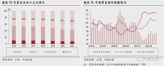 在内需恢复较慢、外需旺盛的情况下,国内更多企业转向外销。2021年,我国有进出口实绩企业56.7万家,增加3.6万家。特别是民营企业因为适应能力强、调整速度快,更多转向外贸行业:2021年,民营企业出口占比为56.0%,较2020年上升了2.0个百分点(见图表13)。并且,在稳外贸政策支持下,跨境电商、市场采购、海外仓等新业态新模式成为推动外贸增长的重要力量。海关数据显示,2021年,跨境电商出口规模增长24.5%;市场采购出口规模增长32.1%,拉动出口增长1.3个百分点。