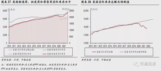 美国补库存需求对中国出口拉动作用有限。我们利用PPI行业数据分别计算制造商、批发商和零售商的实际库存水平,并根据2010年至2019年实际库存数据,利用HP滤波提取趋势项并进行外推发现,三大领域实际库存水平均低于趋势值(见图表27)。即便2022年末实际库存缺口可以全部弥补,回到1.9万亿美元的趋势水平,那么需要增加的实际库存约为2800亿美元(见图表28)。如果以2021年11月份为基期,需要增加的名义库存规模约为3800亿美元。2010年至2019年期间,美国进口金额占库存总额比重均值为11%。在不考虑本国销售和生产变动的情况下,我们据此计算得出,补库存可能带动2022年美国进口增加约420亿美元。由于2010年至2019年美国自中国进口占美国总进口比重为20%,据此估算得到美国补库存需求仅导致中国对美出口增加84亿美元,对中国出口增速的拉动作用依然有限。