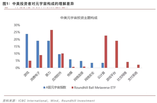 拿中国与美国为例,对于投资者元宇宙的理解都不尽相同。中国强调“沉浸式应用”,美国则突出“功能性平台”。对Wind最新发布的A股元宇宙指数以及美国Roundhill Ball Metaverse ETF的成分股进行整理分析,发现算力和应用软件是中美投资者达成较高共识的版块,但除此之外,中美投资者在布局元宇宙的侧重点存在显著不同(如下图所示)。