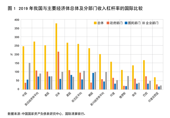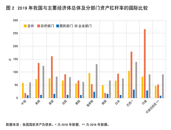 总体较高:如图1所示,2019年我国的总体宏观杠杆率水平为246.5%,稍低于发达经济体平均水平,低于日本、英国和美国,与欧元区平均持平,但明显高于新兴经济体平均,且高于所有的其他主要新兴经济体。鉴于我国仍是一个新兴和发展中经济体,我国的总体宏观杠杆率国际比较处于较高水平。