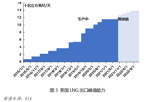 美国LNG产能增长迅速,拓展海外市场成为当务之急。2016-2020年间,美国LNG出口复合增速高达89%,并于2020年创下了614亿立方米的新纪录,占其当年天然气出口总量的44%。与此同时,美国LNG液化装置建设也在不断提速。根据EIA数据,截至2021年11月,美国LNG液化能力约为95亿立方英尺/天,峰值时可达116亿立方英尺/天。到2022年末,美国将拥有44套装置组成的7个LNG生产设施,整体的液化能力将提升至114亿立方英尺/天,峰值能力为139亿立方英尺/天,届时美国将超越澳大利亚与卡塔尔,拥有全球最大的LNG出口能力,因此对于美国而言,为新增产能寻找买家是当前亟需解决的问题。