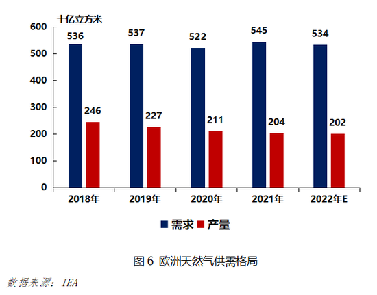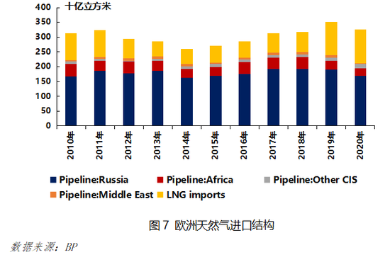俄罗斯管道气将是美国LNG在欧洲的主要的竞争对手。欧洲天然气需求常年依赖进口,根据IEA数据,近年来其自产量占需求量的比例不断降低,由2018年的46%降至2021年的37.4%。从进口结构看,欧洲对俄罗斯管道气的依赖度较大,占比常年维持在40%以上,其他管道气来源依次为非洲、其他独联体国家和中东,供给相对稳定且占比较小,余下部分则以LNG形式进口,呈逐年递增状态。美国想要改变欧洲现有天然气市场格局,首先要想办法踢俄罗斯出局。