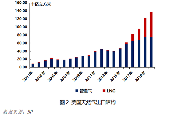 近年来美国页岩气技术日趋成熟,产量不断提升。2016-2020年间,美国天然气产量由7274亿立方米增长至9146亿立方米,贡献了全球天然气供给增量的85%。不断攀升的产能使得美国国内天然气市场出现了供应过剩的现象,美国也因此一跃成为全球天然气主要出口国。根据BP数据,在2016-2020年间美国天然气出口保持着高速增长态势,复合增长率高达22%。2020年,美国天然气出口量为1375亿立方米,占全球天然气贸易量的11%,是全球仅次于俄罗斯的天然气出口国。