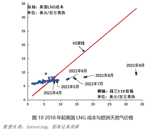 美国LNG出口欧洲常年盈利较少,此次乌克兰危机让其获利颇丰。美国LNG出口成本=天然气成本+液化成本+运输成本+再气化成本,其中天然气成本通常是美国Henry Hub价格乘以1.15,液化成本是2.25-3.5美元/百万英热,运输成本是0.4-1.26美元/百万英热,再气化成本0.34-0.5美元/百万英热。这意味着美国LNG销往欧洲的成本是5-8美元/百万英热,而荷兰TTF天然气价格在过去三年里多数时间都低于此区间,不利于美国出口LNG到欧洲。2021年4月之前,美国与欧洲的LNG贸易基本处于利润微薄或成本倒挂状态,但去年3月乌东事件爆发后,欧洲天然气价格逐步上升,峰值甚至一度达到年初的十倍,这为美国LNG出口欧洲提供了巨大的获利空间。据估算,仅2021年二、三季度,美国从与欧洲LNG贸易中获得的净利润已超过20亿美元。