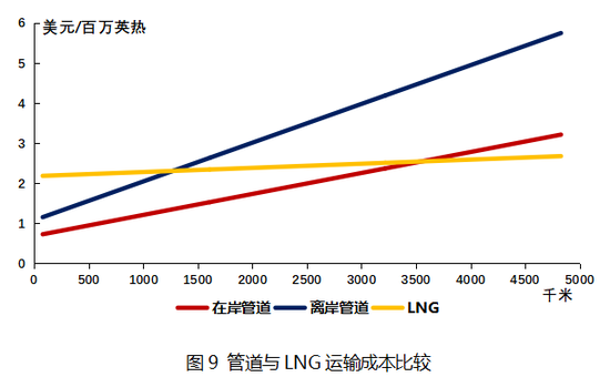 其次,美国LNG运输成本高于俄罗斯管道气。管道运输与LNG海运适用于不同的运输距离,在中短运程上,管道运输具有无可争议的优势,而对于超远距离运输,LNG是一种更经济的选择。具体而言,对于离岸管道,运输距离在1100-1900km内,其成本优于LNG方式;对于在岸管道,距离在3500-4000km内,其运输成本低于LNG方式。相较之下,美国LNG需要跨越大西洋,而俄罗斯紧邻欧洲市场,具备明显的运输成本优势。