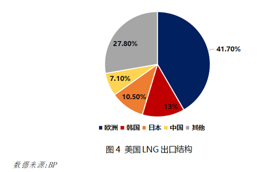 依托于发达的海运体系,美国LNG买家遍布全球。根据出口结构来看,2020年美国出口的LNG中约有41.7%的份额流向欧洲市场,其次占比较大的为亚洲买家日本、韩国及中国,合计占比30.6%。从地理位置来看,美国后续想扩大LNG出口规模主要考虑南美航线、太平洋航线和大西洋航线。其中南美航线运输距离最短,但由于南美洲自身天然气储量丰富,同时其整体工业化水平较低,对于天然气的需求量十分有限,短期内无法承接美国的新增供应量。