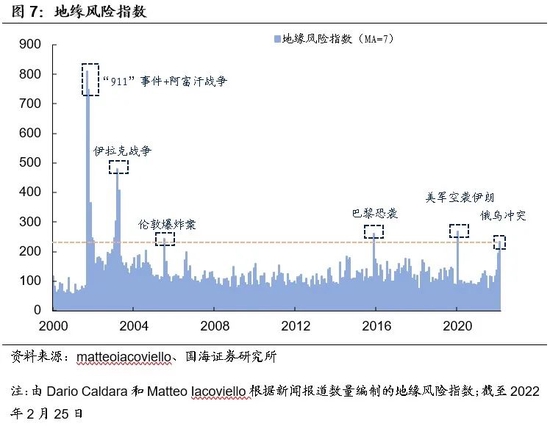 (1)金融层面上,中短期风险偏好的下降可能是一个相对确定的事件。从地缘风险指数上来看,本轮“危机”严重程度位列2000年以来第四,与“伦敦爆炸案”、“巴黎恐袭”和“美军空袭伊朗”事件不同的是,本次“俄乌冲突”前期铺垫较长,因此影响力的演绎上可能并不会使短期脉冲式,而会更加类似“911”事件以及“伊拉克战争”爆发后逐步退波的态势。