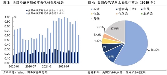 (1)经济层面上,本次冲突,对美国的直接冲击相对可控,更多可能反映在以输入通胀为代表的间接冲击上。从美国和俄罗斯的贸易结构上来看,俄罗斯并不是美国的主要进口国,常年对美出口占美国总进口不足1%,主要出口商品也以石油为主。