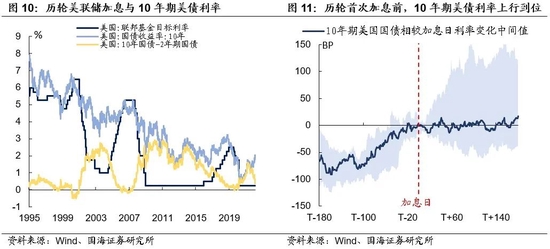 (2)历轮加息周期开启前,美债利率的阶段性上行就已经基本到位。历史上来看,美债利率的反应总是前置的,回顾1990年代以来的几轮加息周期,10年期美债利率在首次加息日前3个月开始上行,并于首次加息开启前基本达到阶段性顶部。