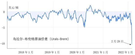 从汤森路透数据来看,在一般情况下,两者价差在2美元/桶上下波动。2月24日战事开启之后,2月28日的价差陡然扩大至10.5美元/桶。由于汤森路透按照成交均价来计算,与其他差价口径相比还有所偏低。