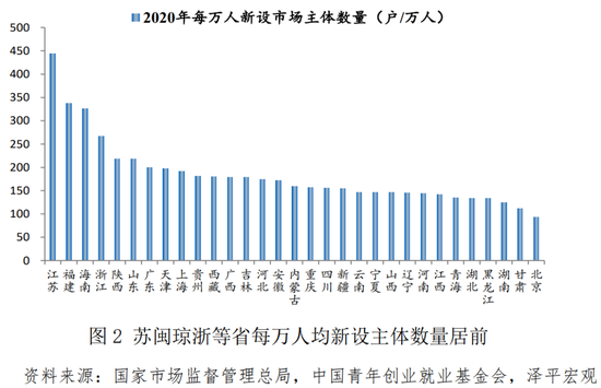 从每万人均新设市场主体数量看,江苏、福建、海南、浙江、陕西等省份创业活跃度高,甘肃较低。根据各省新设市场主体数量及人口,计算每万人均新设市场主体数量,表征创业活跃度。江苏创业活跃度最高,每万人新设市场主体数量达到444.1个,原因在于2020年江苏市场监管部门超前谋划,积极助力企业复工复产。出台支持企业平稳健康发展18条和支持企业复工复产12条措施,并联合相关部门出台支持个体工商户发展16条措施,帮助企业纾困解难,促进市场主体快速发展,营造良好市场环境。同时,抢抓时机,精心打造“一品牌一平台”。为进一步激发市场主体活力,江苏市场监管部门加强了监测分析,加大帮扶力度,优化市场准入服务,支持自贸区制度创新,规范平台集群注册,引导地摊经济健康发展,努力催生更多新的增长点;福建、海南、浙江、陕西、山东则分别占据第二到第六位,而甘肃相对靠后,每万人均新设市场主体数量不及江苏的一半。甘肃主要是因为其经济水平相对落后,2020年GDP在31个省级行政区排27位,人均GDP排名末位,因此创业活跃度较低。