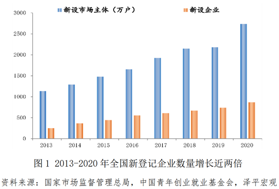 新设市场主体数量快速增长,2020年新设企业超850万。根据中国社科院城市与竞争力研究中心与企查查大数据研究院联合发布的《2020中国企业发展数据年报》显示,2013-2020年全国新设市场主体从1132万户上升至2735万户,增长141.6%,其中,新设企业数量从250万户上升至868万户,增长247.1%;我国市场主体从2012年的5500万户增加到1.44亿户、活跃度稳定在70%左右;发展质量明显提升,高新技术企业、科技型中小企业分别突破20万家和18万家,企业研发投入占全社会支出的76.2%;个体工商户作为一类群众直接开展经营活动的特殊市场主体发展到9670多万户,成为基层群众的就业容纳器、民营企业的后备力量、畅通国内大循环的微循环和各类企业的协作配套伙伴。