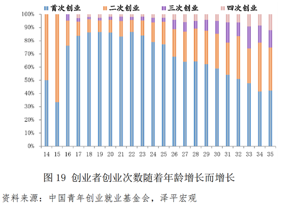 首次创业人数占七成,33岁及以上创业者超50%有二次及以上创业经历。从总量上看,首次创业人数占比74.3%,多次创业人数占比25.7%;从年龄结构看,有多次创业经历的创业者所占比重随着年龄的增加而上升,其中33岁为重要节点,多次创业者占比超过50%,且三次和四次创业者占比达到25.8%。这现象表明,多数首次创业者因年龄小,缺乏实际创业经验,一般首次创业成功率较低。随着年龄增加,这既与创业经验与资源增加有关,也与创业动机更强创业者的“幸存者偏差”有关,因此多次创业者可能创业质量更高、创业前景更好。此外,新冠疫情影响下,就业形势较为严峻,也促使更多青年进行创业。